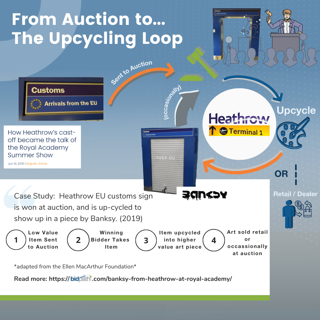 In ‘traditional’ modes of consumption, an item will follow a linear life, also known as the ‘make-take-waste’ or ‘cradle to grave’ path. In ‘auction-driven consumption’, an item can face multiple, and in many cases, infinite life cycles along the four different loops that exist in the auction industry; we like to refer to these four loops as ‘The Auction Loop’, ‘The Repair Loop’, ‘The Upcycling Loop’ and ‘The Recycling/Remanufacturing Loop’. The closer the loop is to the center of the model, the more potential life cycles it can create within the system.